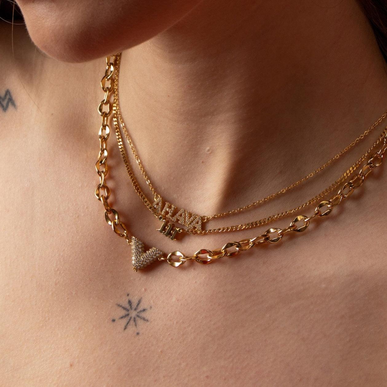 Unleash your unique style with our Custom Crystal Name Necklace! Made with sparkling crystals and gold vermeil, this personalized necklace makes a statement like no other. Show off your individuality and make heads turn with this stunning piece.