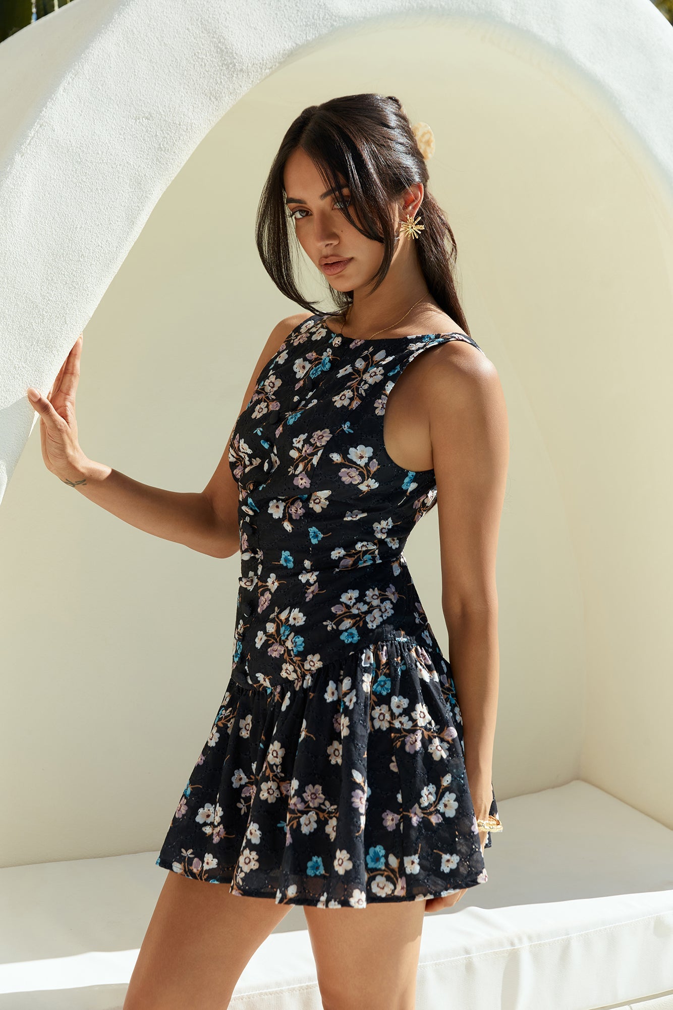 The Love And Luxury Mini Dress is your go-to for warm-weather celebrations. Featuring a chic high neckline and playful short sleeves, this mini is adorned with a lively floral print that radiates charm. Its flattering silhouette and flowy hemline create an air of effortless elegance, perfect for twirling through summer days and moonlit evenings.