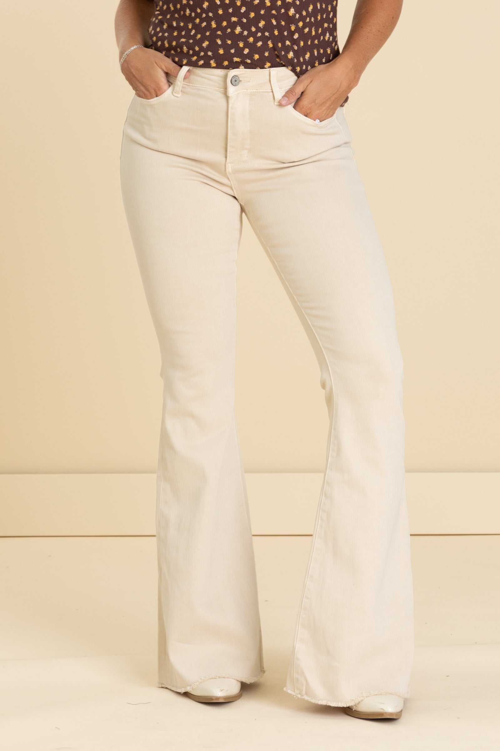 Vervet Beige High Rise Raw Hem Flare Jeans